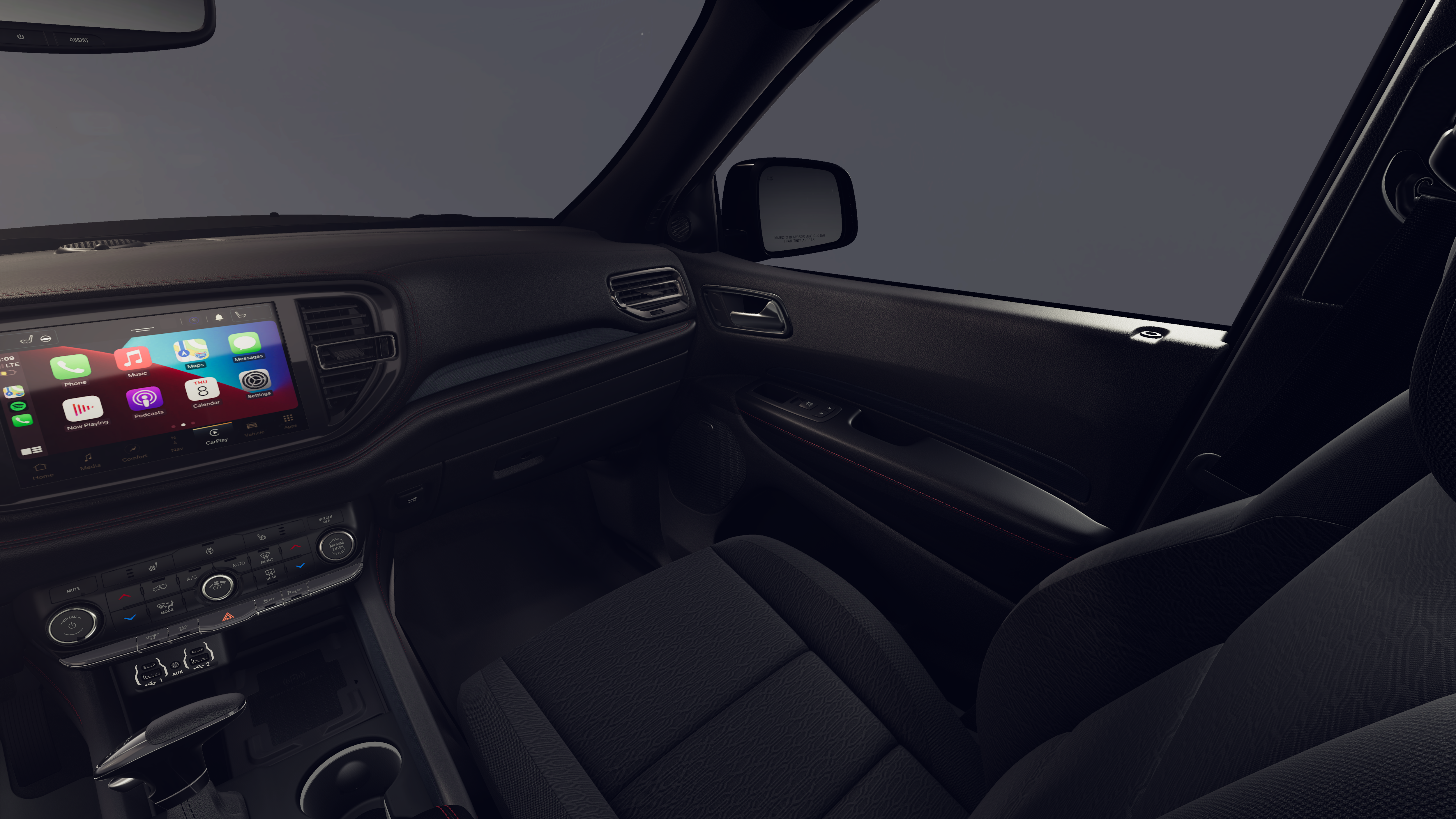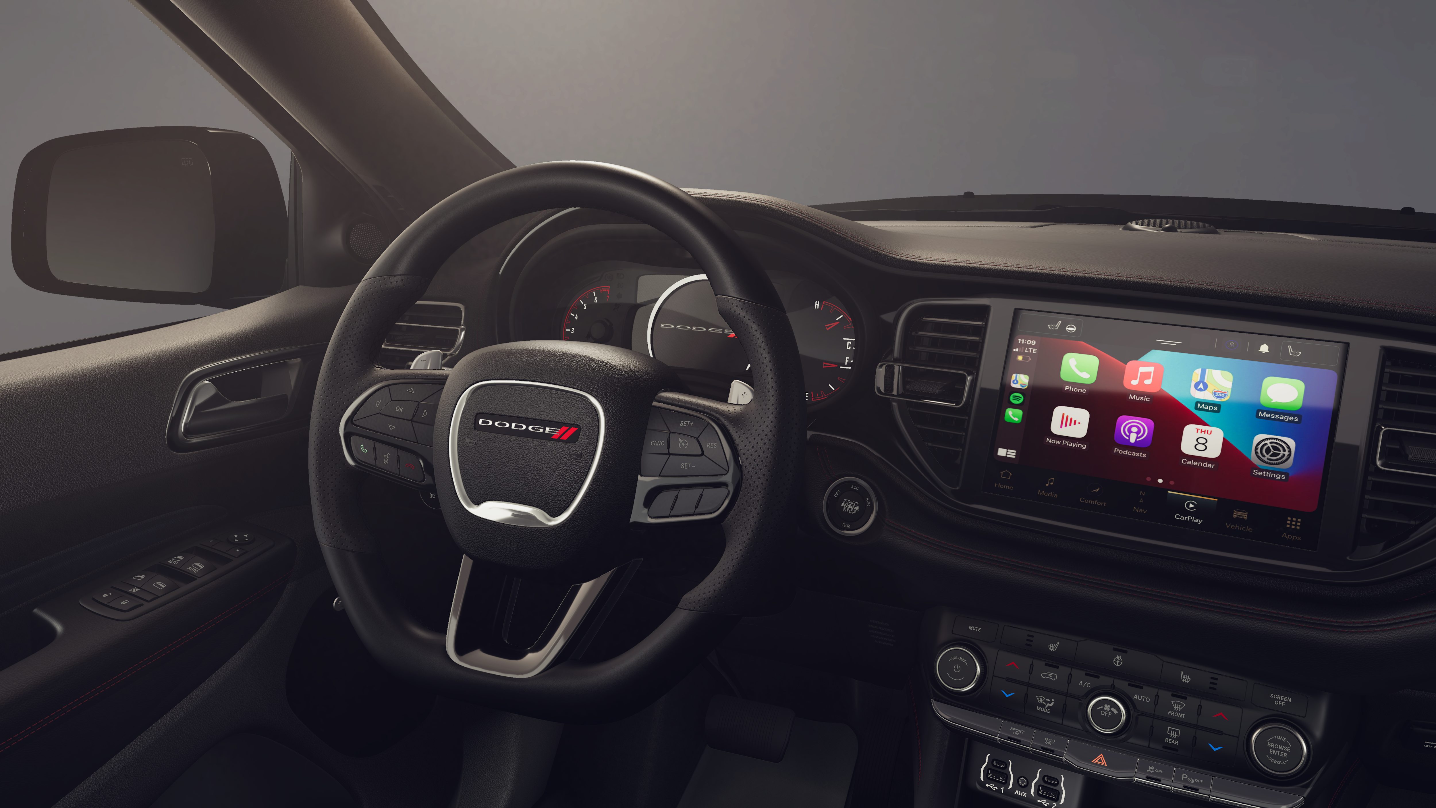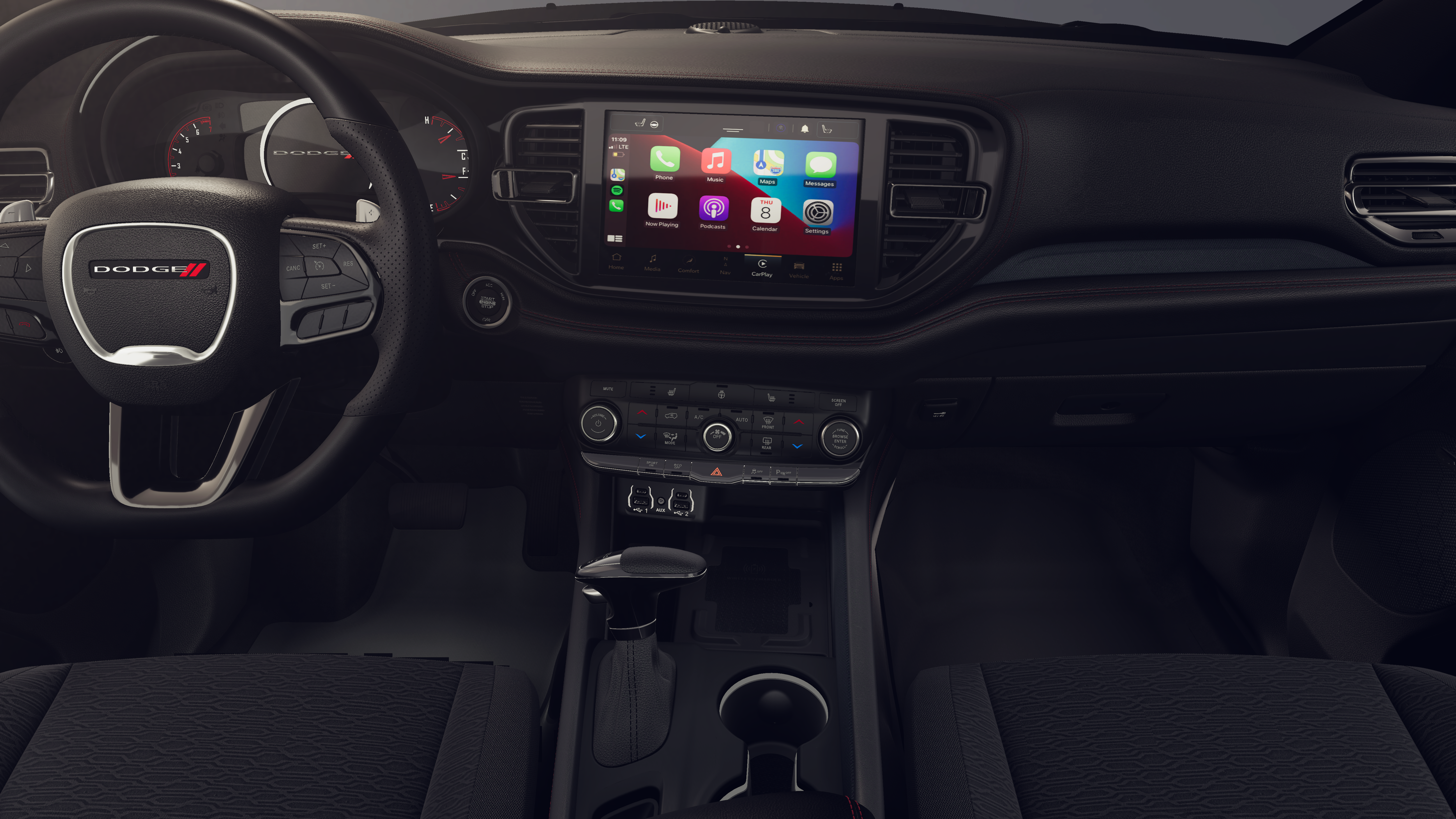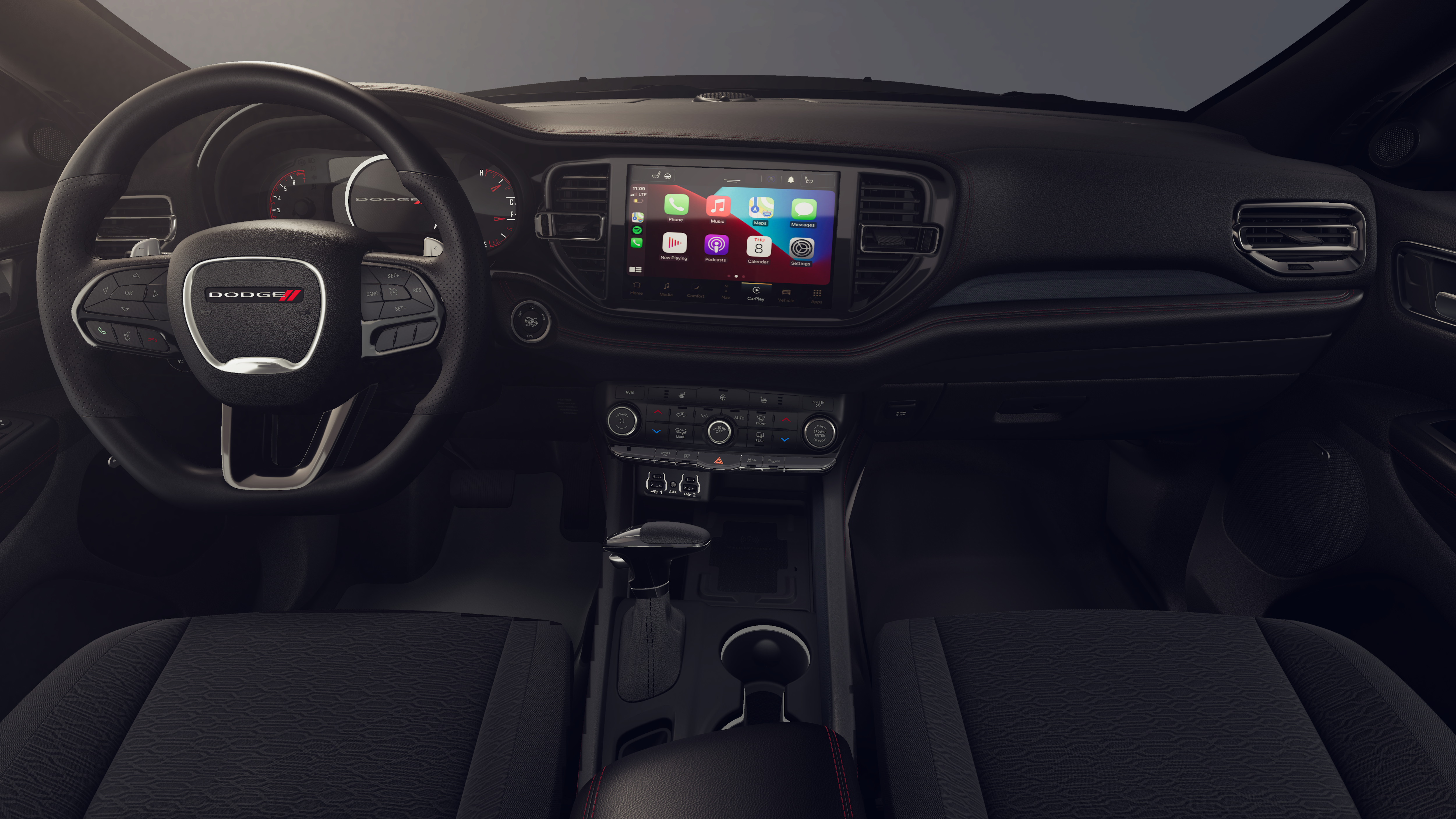 This 2026 Dodge Durango GT HEMI V8 comes nicely equipped with the following Blacktop Package (Black Roof Rails, Gloss Black Badges, Integrated Roof Rail Crossbars, and Satin Black Dodge Tail Lamp Badge), Quick Order Package 22S GT, 3.09 Rear Axle Ratio, 3rd row seats: split-bench, 4-Wheel Disc Brakes, 9 Speakers, ABS brakes, Air Conditioning, Alloy wheels, AM/FM radio: SiriusXM w/360L, Apple CarPlay/Android Auto, Auto-dimming Rear-View mirror, Auto-leveling suspension, Automatic temperature control, Brake assist, Bumpers: body-color, Cloth Bucket Seats with Shift Insert, Compass, Delay-off headlights, Driver door bin, Driver vanity mirror, Dual front impact airbags, Dual front side impact airbags, Electronic Stability Control, Emergency communication system: Dodge Connect, Exterior Mirrors with Heating Element, Four wheel independent suspension, Front anti-roll bar, Front Bucket Seats, Front Center Armrest w/Storage, Front dual zone A/C, Front reading lights, Fully automatic headlights, Garage door transmitter, Gloss Black Exterior Mirrors, Heated door mirrors, Heated front seats, Heated steering wheel, Illuminated entry, Knee airbag, Leather steering wheel, Low tire pressure warning, Navigation System, Occupant sensing airbag, Outside temperature display, Overhead airbag, Overhead console, Panic alarm, ParkView Rear Back-Up Camera, Passenger door bin, Passenger vanity mirror, Power door mirrors, Power driver seat, Power Liftgate, Power steering, Power windows, Radio data system, Radio: Uconnect 5 Nav with 10.1 Display, Rain sensing wipers, Rear air conditioning, Rear anti-roll bar, Rear Load Leveling Suspension, Rear reading lights, Rear seat center armrest, Rear window defroster, Rear window wiper, Red Accent Stitching, Remote keyless entry, Security system, Speed control, Speed-sensing steering, Speed-Sensitive Wipers, Split folding rear seat, Spoiler, Sport steering wheel, Steering wheel mounted audio controls, Tachometer, Telescoping steering wheel, Tilt steering wheel, Traction control, Trip computer, Variably intermittent wipers, Voltmeter, and Wheels: 20 x 8 Satin Carbon Split 5-Spoke.