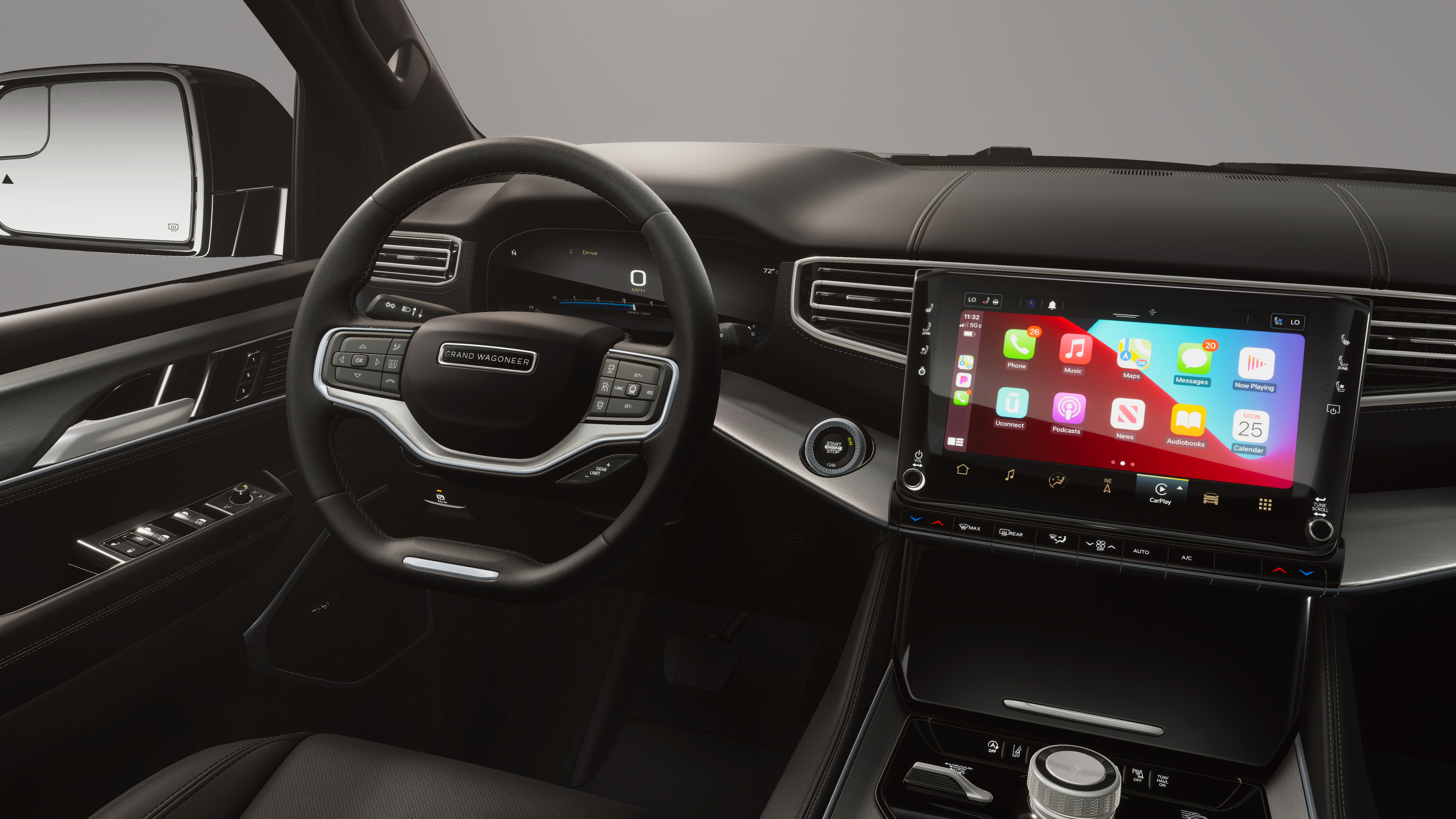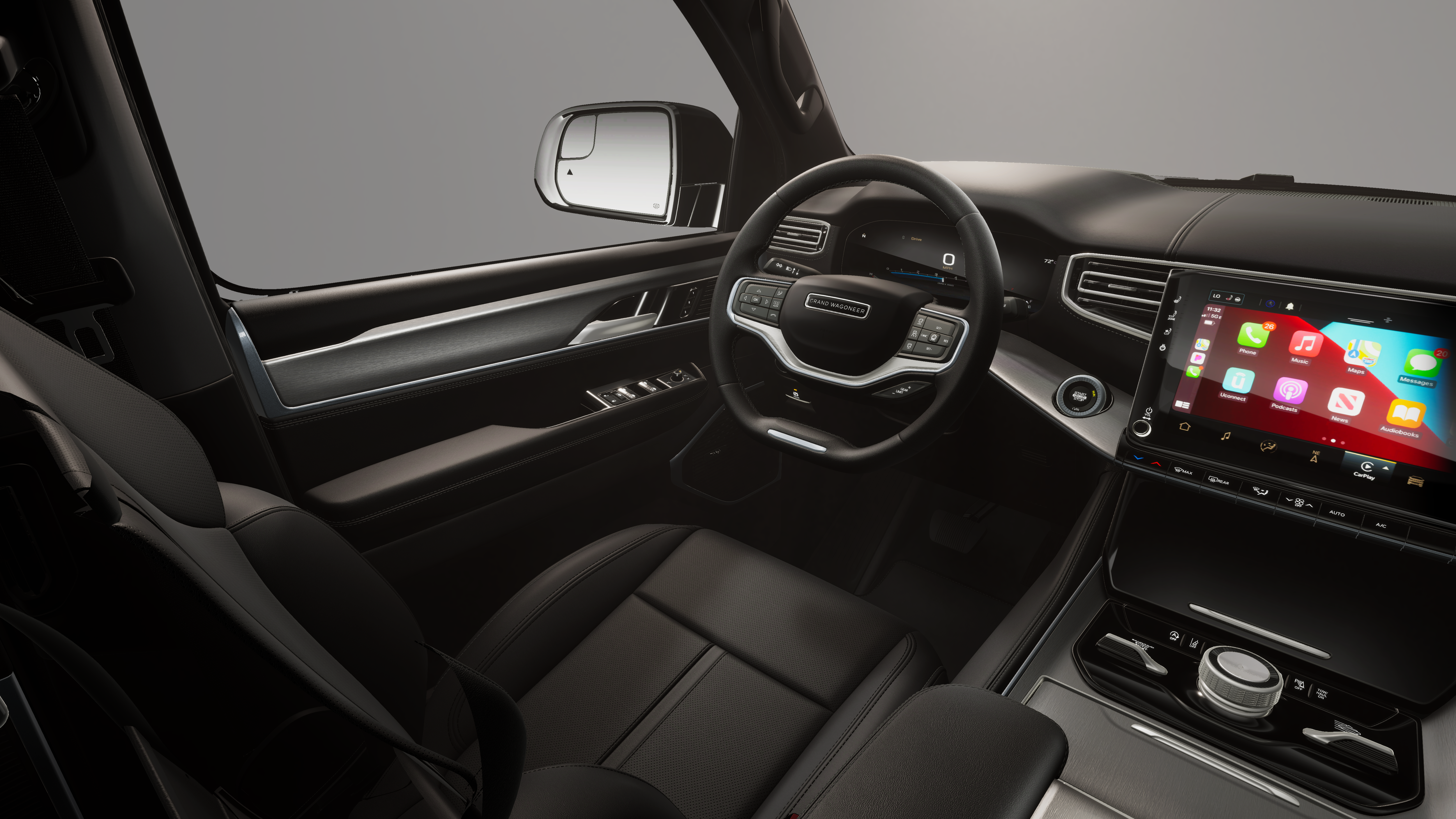 This 2026 Jeep Grand Wagoneer comes nicely equipped with the following Black Appearance Package (118 Mph Maximum Speed Calibration, Black Exterior Accents, Titanium Daylight Opening Upper, Titanium Upper Grille Applique, and Wheels: 22 x 9 Painted Gloss Black), Limited Reserve Package, Quick Order Package 29D Reserve (19 Speaker McIntosh Audio System, 2nd Row Manual Window Shades, 3 Panel Sunroof, Augmented HUD, Cargo Cover, Cluster 12 TFT Color Display, Instrument Panel, Interior Rear Facing Camera, Luxury Front and Rear Floor Mats, P and P Park and Unpark Assist with Stop System, Power Deployable Running Boards, Quadra-Lift Air Suspension, Reversible Carpet/Vinyl Cargo Mat, Semi Active Damping, Side Distance Warning, Smartphone as a Key Prep, and Surround View Camera System), 3.55 Rear Axle Ratio, 3rd row seats: bench, 4-Wheel Disc Brakes, 9 Speakers, ABS brakes, Air Conditioning, Alloy wheels, AM/FM radio: SiriusXM with 360L, Anti-whiplash front head restraints, Apple CarPlay/Android Auto, Audio memory, Auto Adjust in Reverse Exterior Mirrors, Auto High-beam Headlights, Auto-dimming door mirrors, Auto-Dimming Exterior Driver Mirror, Auto-dimming Rear-View mirror, Auto-leveling suspension, Automatic temperature control, Brake assist, Bumpers: body-color, Compass, Delay-off headlights, Driver door bin, Driver vanity mirror, Driver's Seat Mounted Armrest, Dual front impact airbags, Dual front side impact airbags, Electronic Stability Control, Emergency communication system: Jeep Connect, Exterior Mirrors Approach Lamps, Exterior Mirrors with Memory, Exterior Mirrors with Supplemental Signals, Exterior Parking Camera Rear, Four wheel independent suspension, Front anti-roll bar, Front Bucket Seats, Front Center Armrest w/Storage, Front dual zone A/C, Front fog lights, Front reading lights, Fully automatic headlights, Garage door transmitter, Heated door mirrors, Heated Exterior Mirrors, Heated front seats, Heated rear seats, Heated steering wheel, Illuminated entry, Knee airbag, Leather Trimmed Bucket Seats, Low tire pressure warning, Manufacturer Statement of Origin, Memory seat, Navigation System, Normal Duty Suspension, Occupant sensing airbag, Outside temperature display, Overhead airbag, Overhead console, Panic alarm, Passenger door bin, Passenger seat mounted armrest, Passenger vanity mirror, Power door mirrors, Power driver seat, Power Liftgate, Power passenger seat, Power steering, Power windows, Radio data system, Radio: Uconnect 5 Nav with 12.0 Display, Rain sensing wipers, Rear air conditioning, Rear anti-roll bar, Rear reading lights, Rear seat center armrest, Rear window defroster, Rear window wiper, Reclining 3rd row seat, Remote keyless entry, Security system, Speed control, Speed-sensing steering, Speed-Sensitive Wipers, Split folding rear seat, Steering wheel memory, Steering wheel mounted audio controls, Tachometer, Telescoping steering wheel, Tilt steering wheel, Traction control, Trip computer, Turn signal indicator mirrors, Variably intermittent wipers, Ventilated front seats, Ventilated rear seats, Voltmeter, and Wheels: 20 x 9 Aluminum Painted.