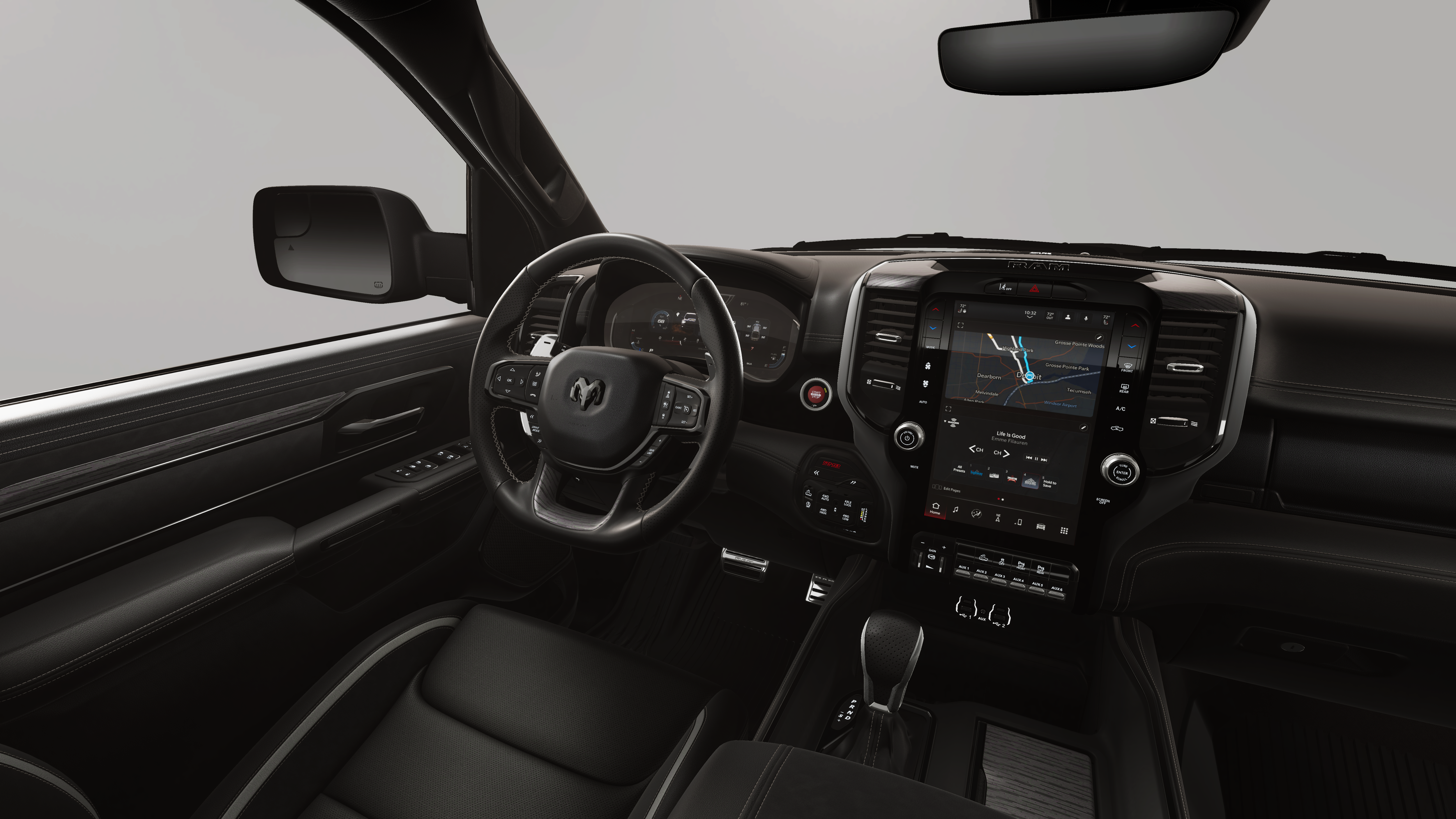 This 2026 Ram 1500 RHO comes nicely equipped with the following Quick Order Package 22Y RHO, 10 Speakers, 3.92 Rear Axle Ratio, 4-Wheel Disc Brakes, 4G LTE Wi-Fi Hot Spot, ABS brakes, Adaptive suspension, Adjustable pedals, Air Conditioning, Alloy wheels, AM/FM radio, Apple CarPlay/Android Auto, Auto High-beam Headlights, Auto Power-Folding Mirrors, Auto-dimming door mirrors, Auto-Dimming Exterior Driver Mirror, Auto-dimming Rear-View mirror, Automatic temperature control, Brake assist, Compass, Connected Travel and Traffic Services, Connectivity - US/Canada, Delay-off headlights, Disassociated Touchscreen Display, Driver door bin, Driver vanity mirror, Dual front impact airbags, Dual front side impact airbags, Electronic Stability Control, Exterior Mirrors Courtesy Lamps, Exterior Mirrors with Heating Element, Exterior Mirrors with Supplemental Signals, Exterior Parking Camera Rear, Flareside Box, Front anti-roll bar, Front Bucket Seats, Front Center Armrest w/Storage, Front dual zone A/C, Front fog lights, Front License Plate Bracket, Front reading lights, Front wheel independent suspension, Fully automatic headlights, Garage door transmitter, GPS Navigation, HD Radio, Heated door mirrors, Heated front seats, Heated steering wheel, Illuminated entry, Integrated Center Stack Radio, Integrated Voice Command with Bluetooth®, Leather Shift Knob, Leather steering wheel, Leather Trimmed Bucket Seats, Low tire pressure warning, Manufacturer's Statement of Origin, MOPAR Off-Road Style Running Boards, Navigation System, Occupant sensing airbag, Outside temperature display, Overhead airbag, Overhead console, Panic alarm, Passenger door bin, Passenger vanity mirror, Power door mirrors, Power driver seat, Power passenger seat, Power steering, Power windows, Radio data system, Radio: Uconnect 5 Navigation with 12.0 Display, Rear reading lights, Rear seat center armrest, Rear step bumper, Rear window defroster, Remote keyless entry, Security system, SiriusXM Radio Service, Speed control, Split folding rear seat, Sport steering wheel, Steering wheel mounted audio controls, Tachometer, Telescoping steering wheel, Tilt steering wheel, Traction control, Trip computer, Turn signal indicator mirrors, USB Host Flip, Variably intermittent wipers, Voltmeter, and Wheels: 18 x 9 Black Paint/Polish Aluminum.