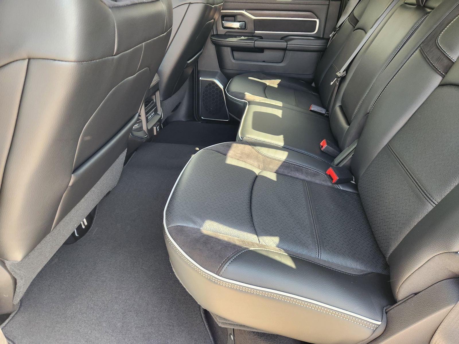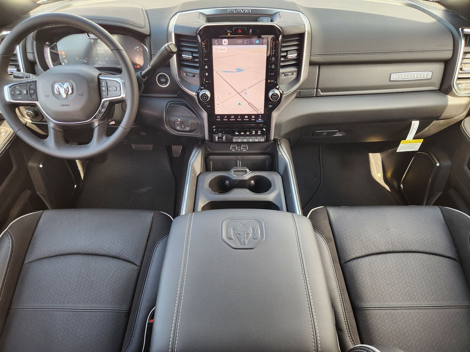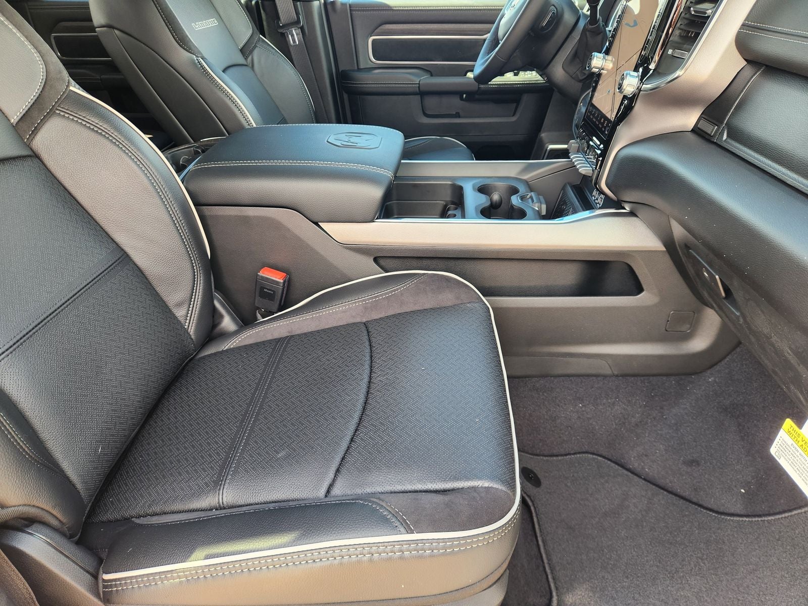 Elevate your driving experience with the unparalleled comfort and convenience of the Laramie's premium interior. Sink into the plush, leather-trimmed bucket seats with ventilation and enjoy the convenience of the full-length upgraded floor console and dual wireless charging pads.