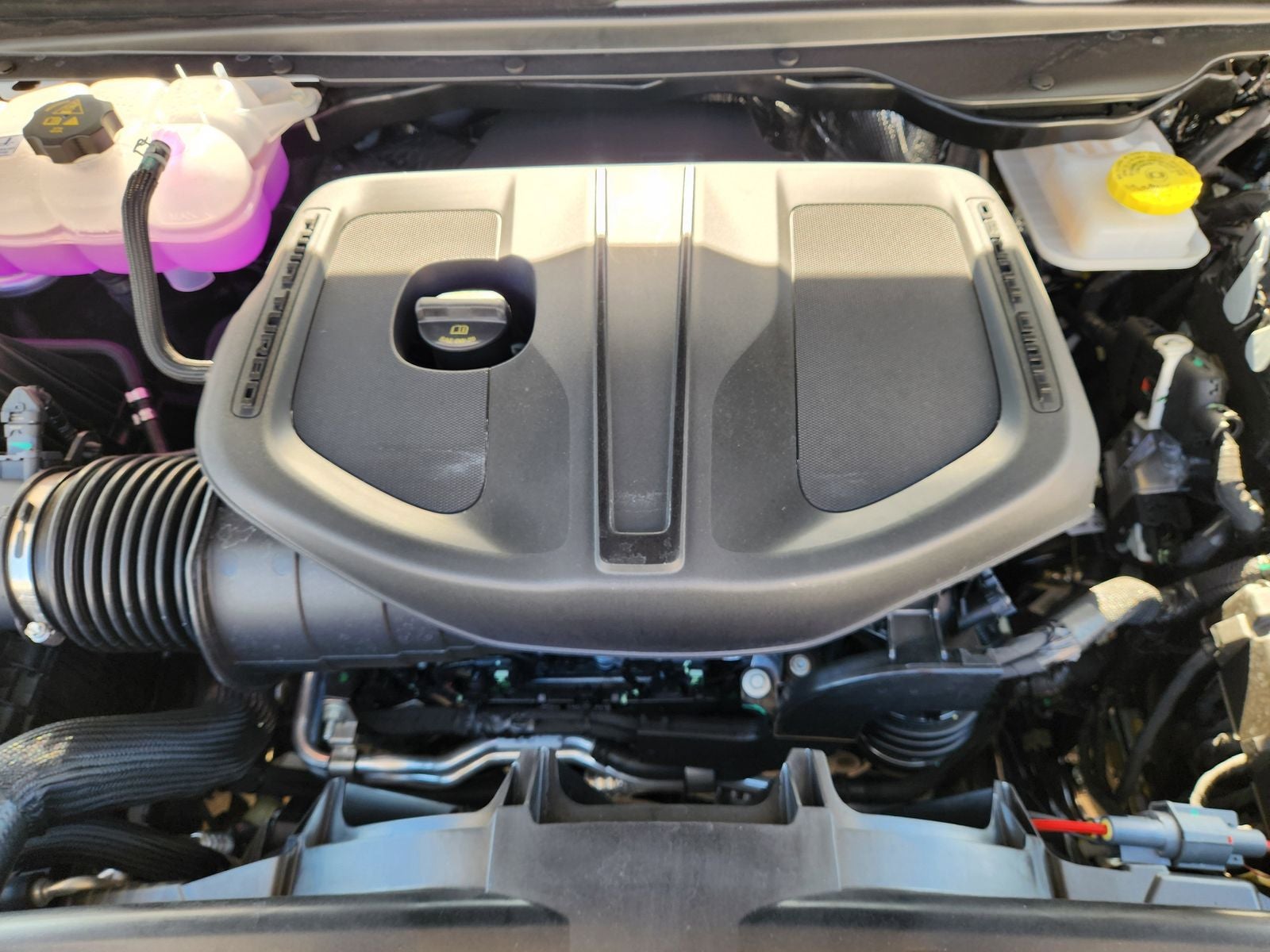 The Laramie's interior is a true sanctuary, with premium leather-trimmed bucket seats that offer both heating and ventilation for your utmost comfort. The dual-pane panoramic sunroof floods the cabin with natural light, creating a spacious and airy atmosphere. The Uconnect 5 Navigation system with a 12-inch display keeps you connected and informed, while the 10-speaker audio system delivers an immersive listening experience.