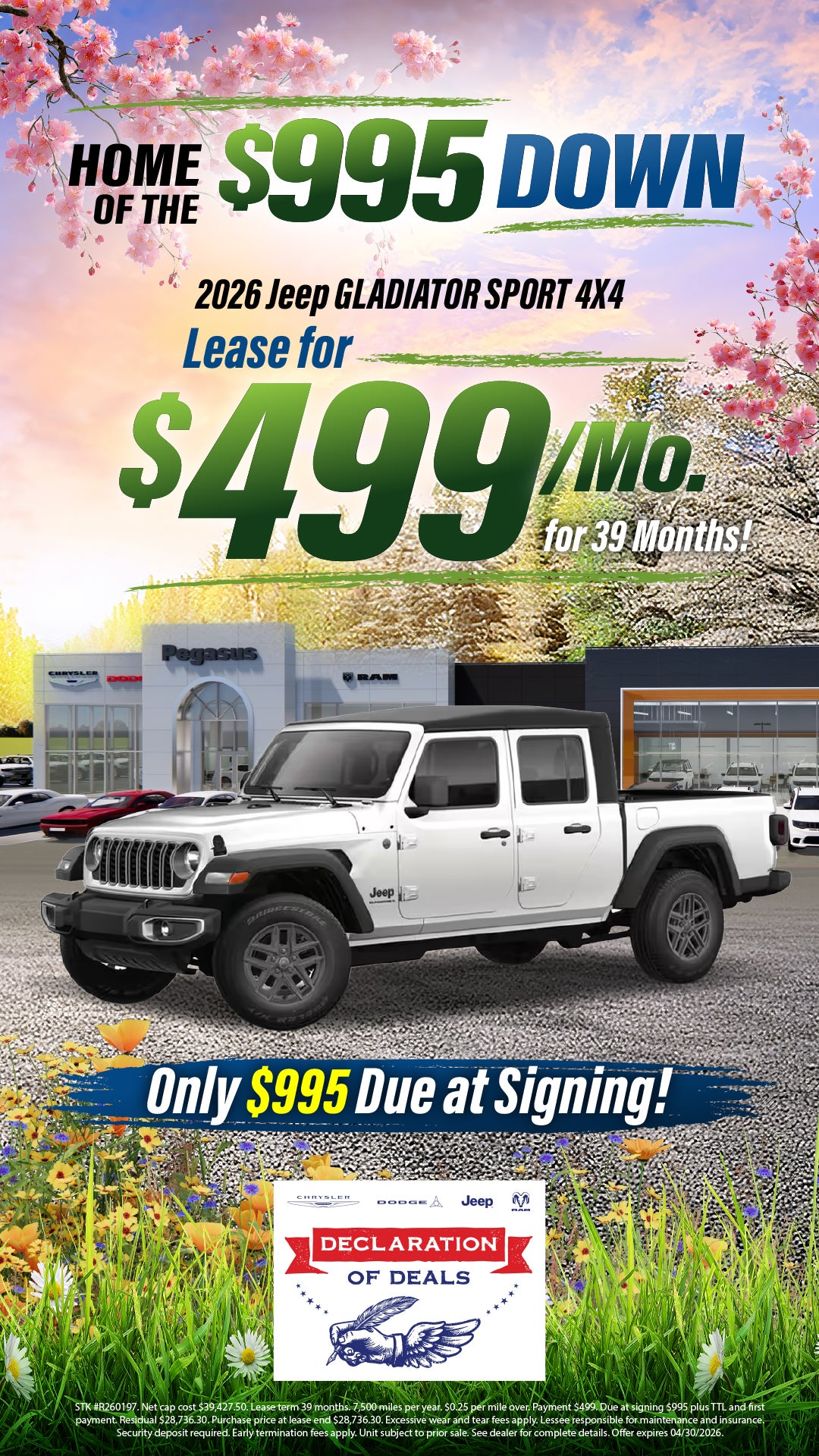 STK #R260197. Net cap cost $39,427.50. Lease term 39 months. 7,500 miles per year. $0.25 per mile over. Payment $499. Due at signing $995 plus TTL and first payment. Residual $28,736.30. Purchase price at lease end $28,736.30. Excessive wear and tear fees apply. Lessee responsible for maintenance and insurance. Security deposit required. Early termination fees apply. Unit subject to prior sale. See dealer for complete details. Offer expires 04/30/2026.