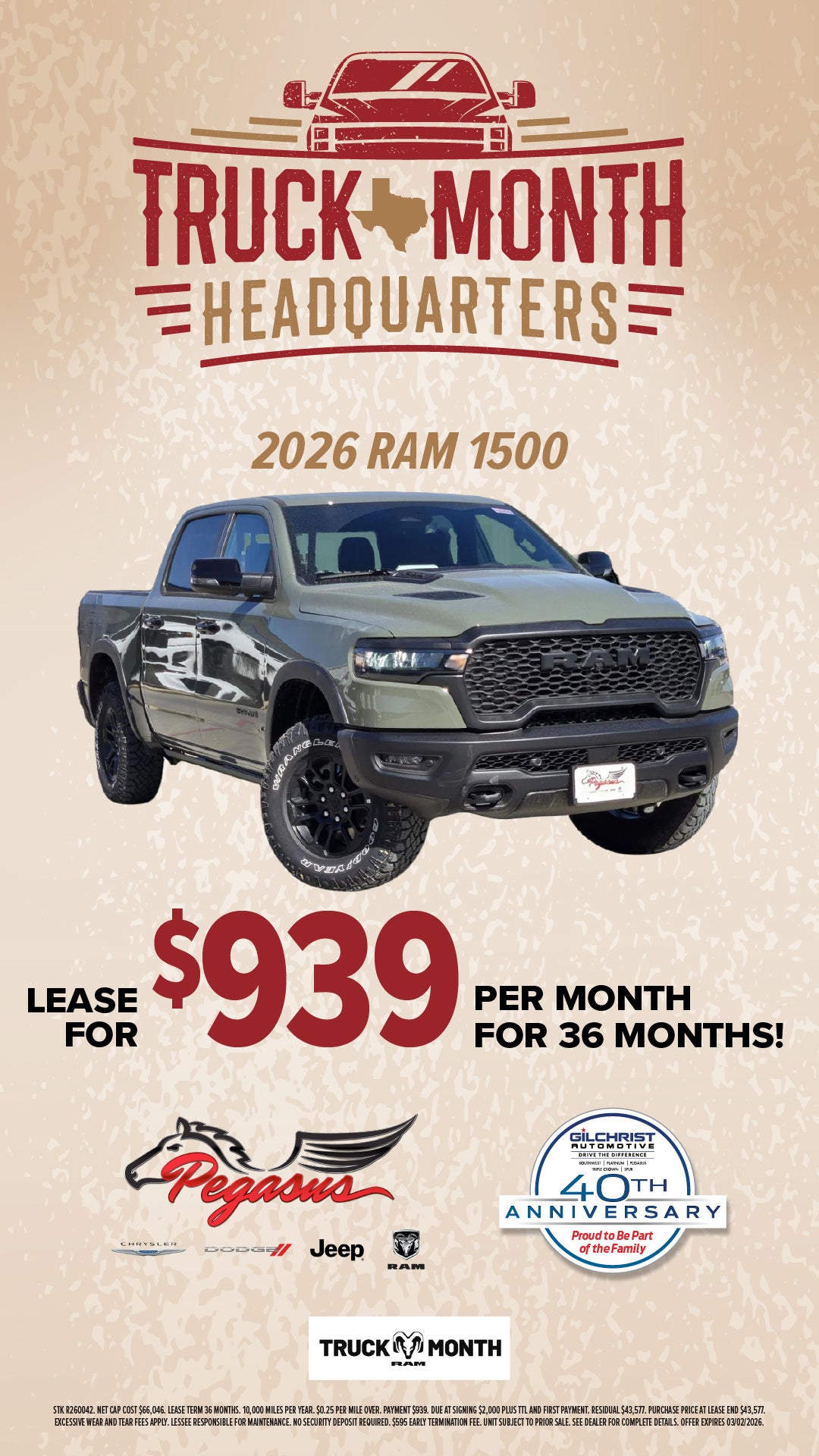 STK R260042. NET CAP COST $66,046. LEASE TERM 36 MONTHS. 10,000 MILES PER YEAR. $0.25 PER MILE OVER. PAYMENT $939. DUE AT SIGNING $2,000 PLUS TTL AND FIRST PAYMENT. RESIDUAL $43,577. PURCHASE PRICE AT LEASE END $43,577. EXCESSIVE WEAR AND TEAR FEES APPLY. LESSEE RESPONSIBLE FOR MAINTENANCE. NO SECURITY DEPOSIT REQUIRED. $595 EARLY TERMINATION FEE. UNIT SUBJECT TO PRIOR SALE. SEE DEALER FOR COMPLETE DETAILS. OFFER EXPIRES 03/02/2026.